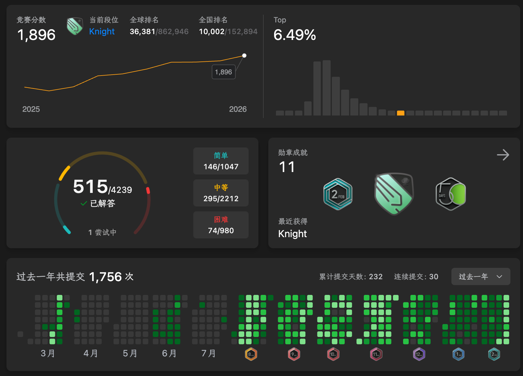 还有个好消息是,LC周赛打上Knight了,真是可喜可贺可喜可贺.